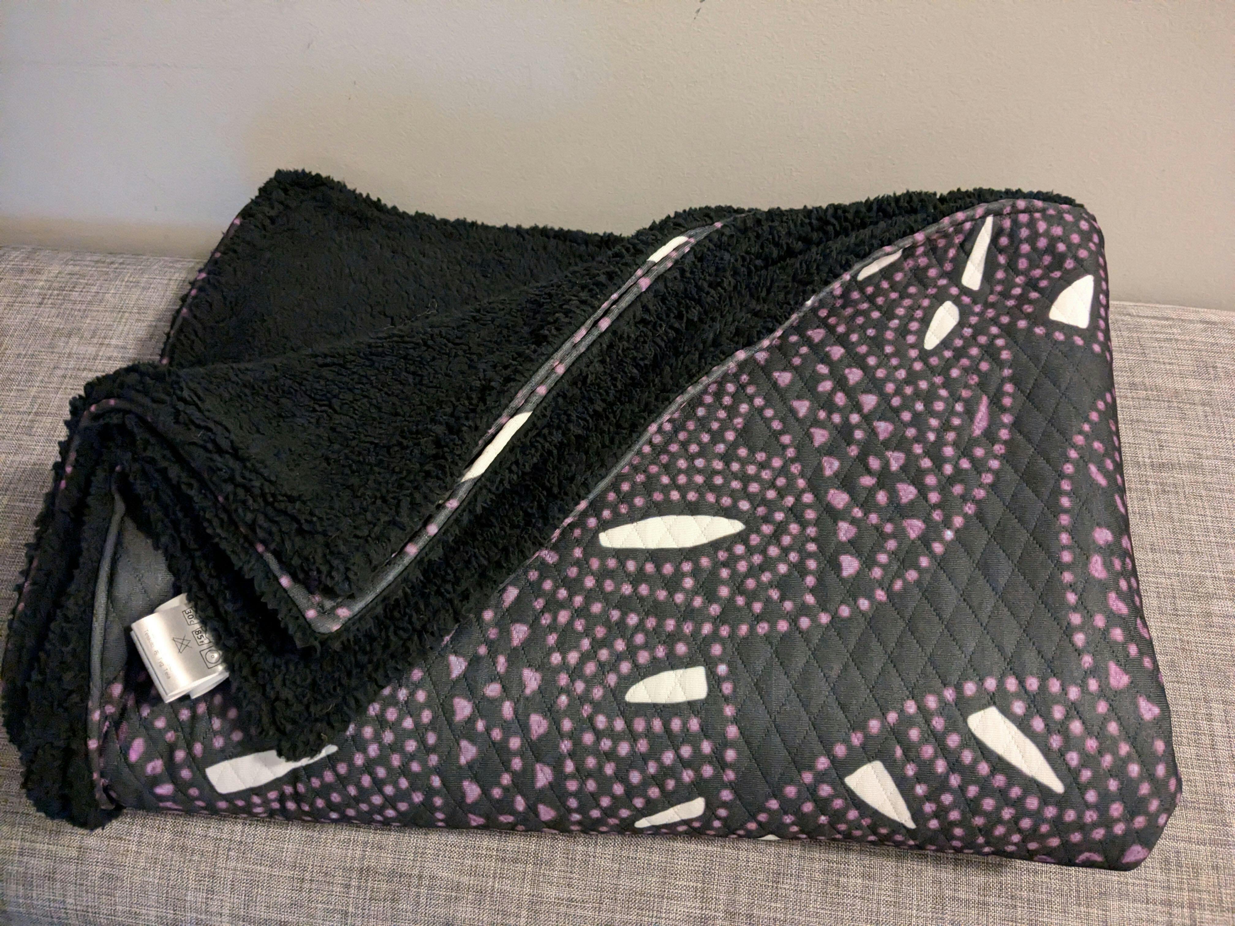 The Fiesta throw blanket is even prettier than I expected! I got the purple one and I basically have been wearing it around the house. The color is beautiful and in the right light it looks almost sparkly, and the back is super soft fleece. I ordered 2 blankets and they arrived within a week to the west coast. Highly recommended!