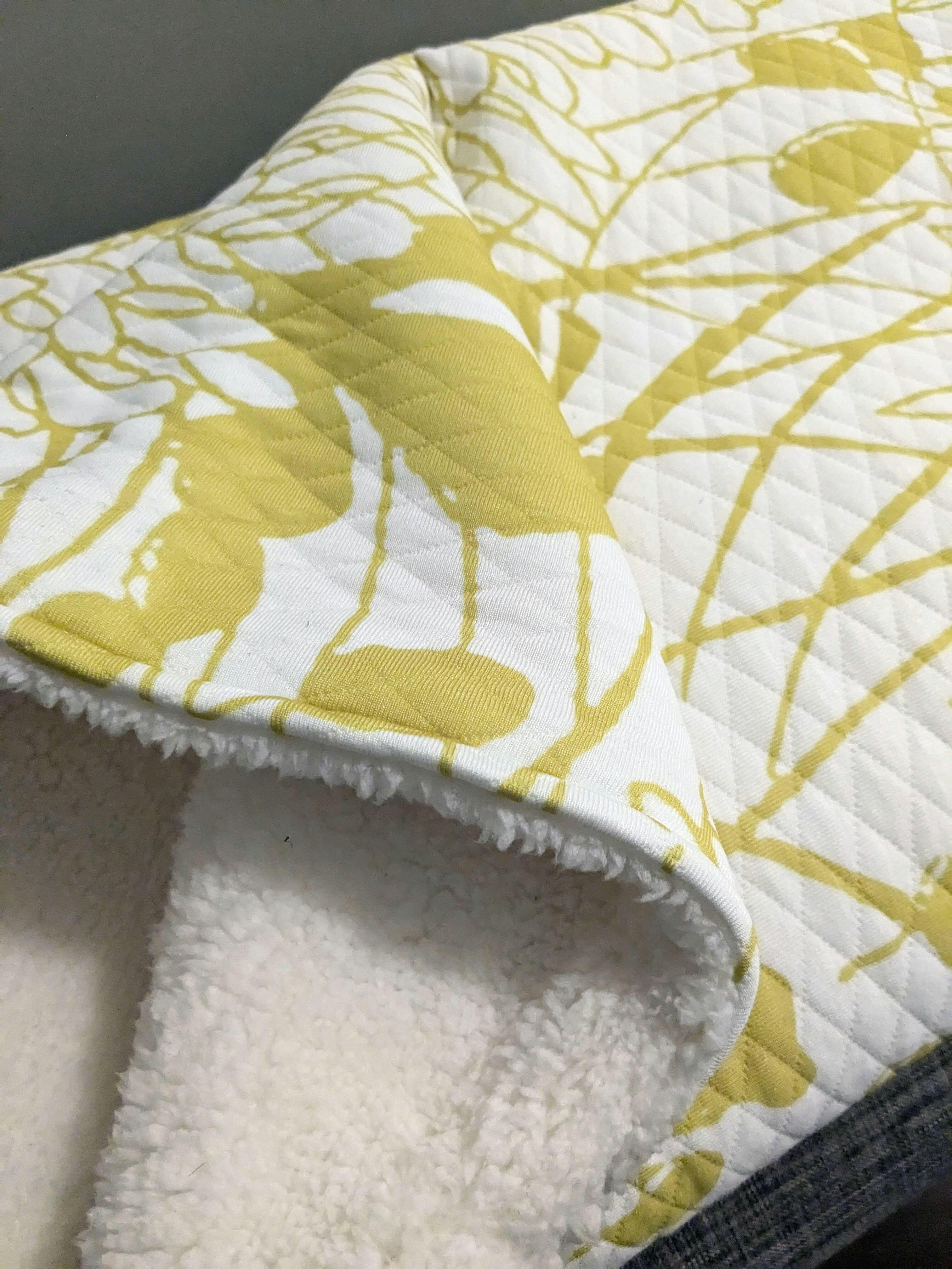The chrysanthemum blanket is so stunning - I've been keeping mine in my office for when it gets a bit chilly. I have the Fiesta blanket too, same size, but the chrysanthemum one has white fleece on the back. Also, my review photo isn’t showing the color right- it’s definitely a golden yellow and not greenish. Shipping was faster than I expected to the west coast, esp with these shipping from London. Highly recommended!