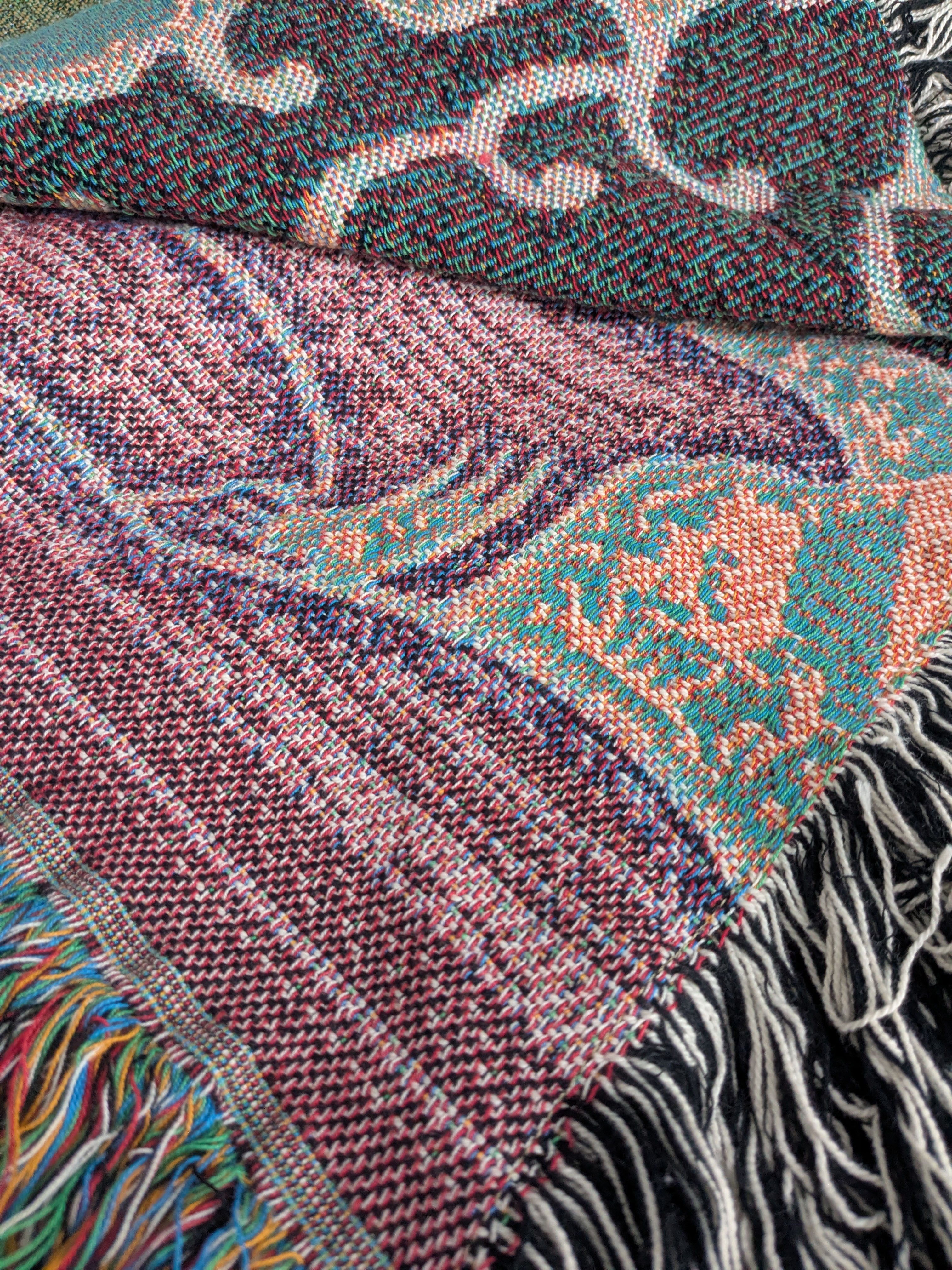 The Fiesta throw blanket is even prettier than I expected! I got the purple one and I basically have been wearing it around the house. The color is beautiful and in the right light it looks almost sparkly, and the back is super soft fleece. I ordered 2 blankets and they arrived within a week to the west coast. Highly recommended!